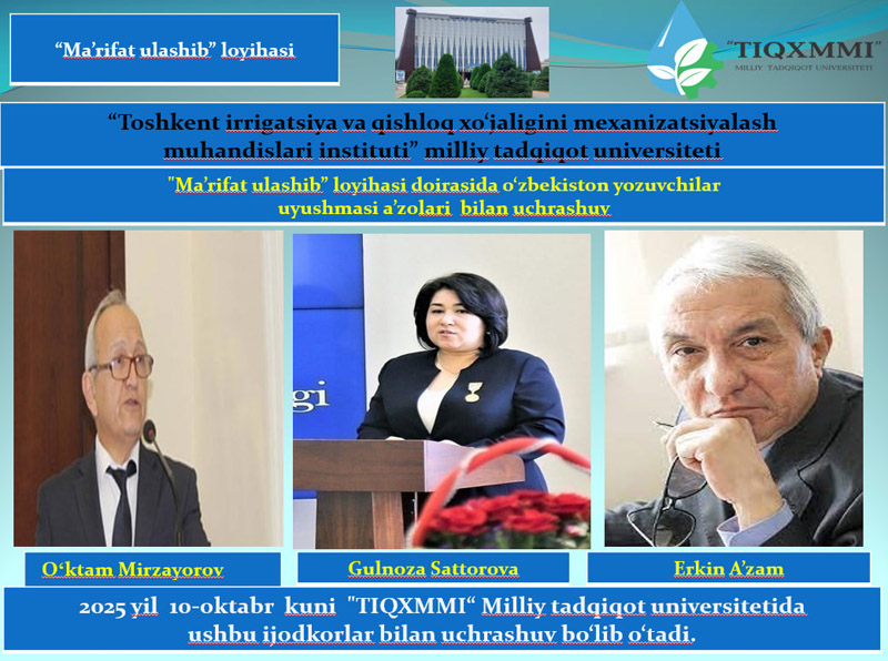 2025 yil 10-oktyabr kuni “Toshkent irrigatsiya va qishloq xo‘jaligini mexanizatsiyalash muhandislari instituti” Milliy tadqiqot universitetida “Ma’rifat ulashib” loyihasi doirasida o‘zbekiston yozuvchilar uyushmasi a’zolari bilan uchrashuv bo‘lib o‘tadi.