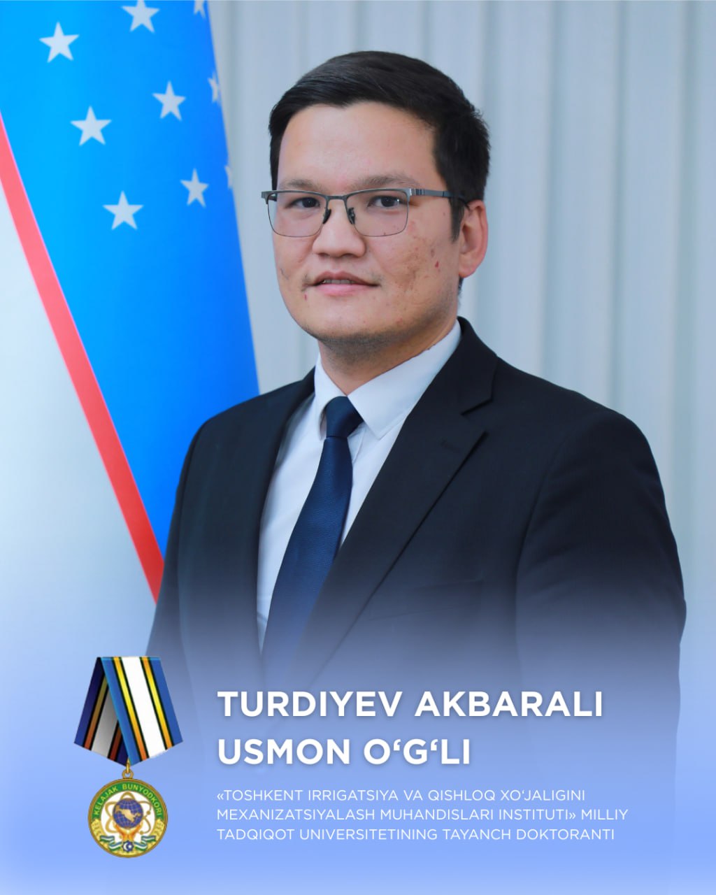 Turdiyev Akbarli Usmon o‘g‘li —"TIQXMMI" Milliy tadqiqot universiteti tayanch doktoranti.
