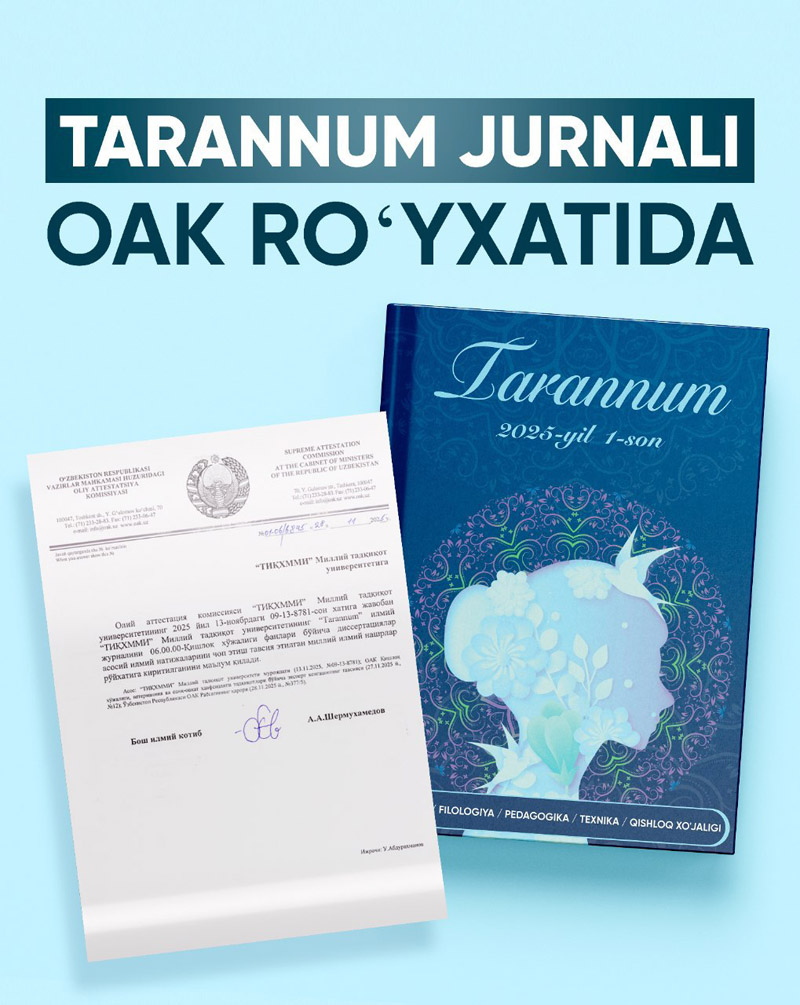 Журнал "Тараннум," учрежденный Национальным исследовательским университетом "Ташкентский институт инженеров ирригации и механизации сельского хозяйства," включен в список научных изданий, рекомендуемых Высшей аттестационной комиссией Республики Узбекистан (ВАК) для публикации научных статей.