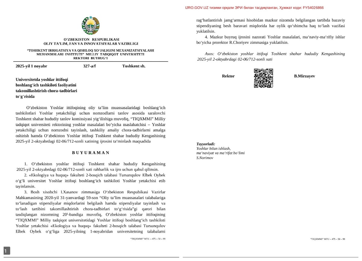 2025-yil 1-noyabrdagi 327-a/f-sonli buyruq bilan: Elbek Tursunkulov O'zbekiston Yoshlar Ittifoqi "TIQXMMI" Milliy Tadqiqot universiteti boshlang'ich tashkiloti yetakchisi-rektorning Yoshlar masalalari bo'yicha maslahatchisi etib tayinlandi.