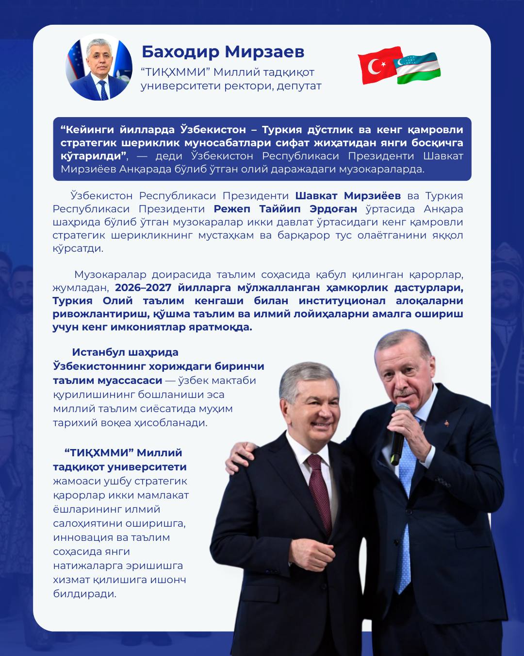“Keyingi yillarda O‘zbekiston – Turkiya do‘stlik va keng qamrovli strategik sheriklik munosabatlari sifat jihatidan yangi bosqichga ko‘tarildi”, — dedi O‘zbekiston Respublikasi Prezidenti Shavkat Mirziyoev...
