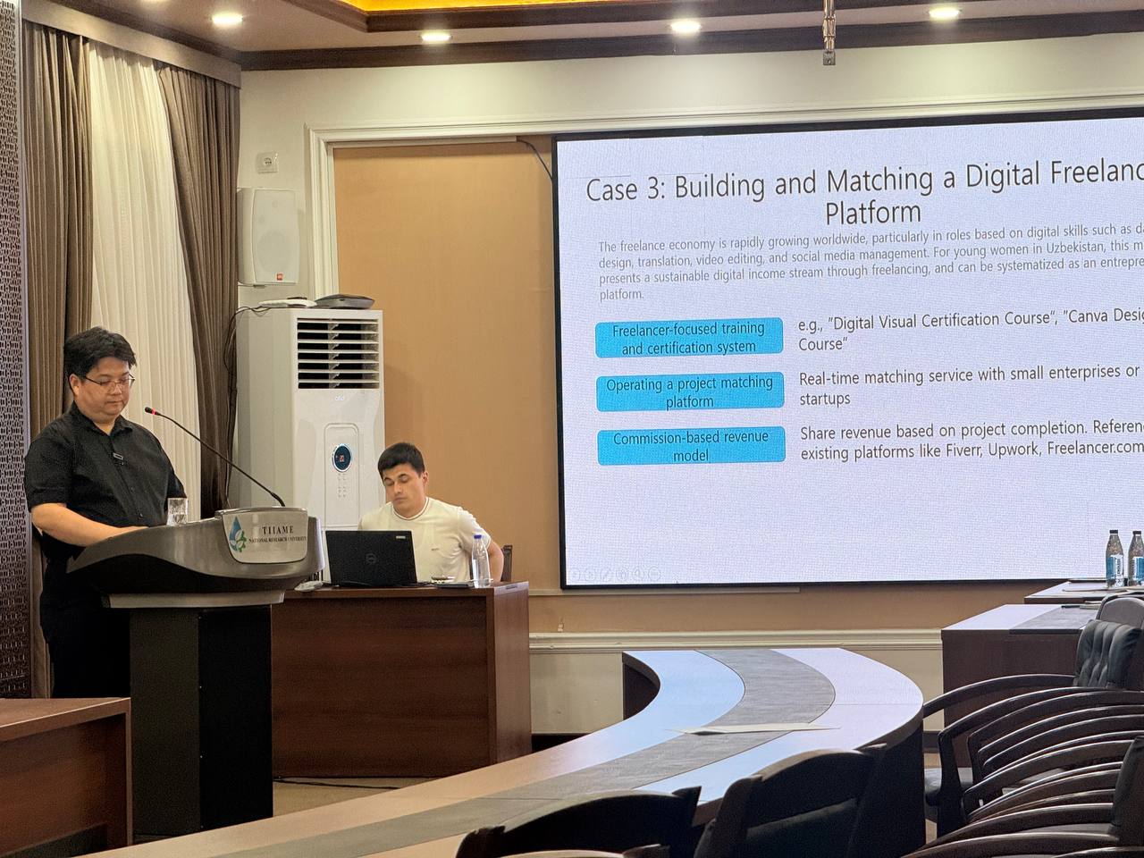 Seminar-treningni Janubiy Koreyaning “InsolMnT” kompaniyasi vakili Kim-In-chul, “Double M Social”kompaniyasinining vakili Kim Sun-mi tomonidan qilingan taqdimotlarda Start up loyixalar yozish, tadbirkorlik ko’nikmlarni rivojlantirish, Informatision Texnologiya bo’yicha bilim va ko’nikmalarni oshirishga qaratilgan sermazmun taqdimotlar tinglandi.