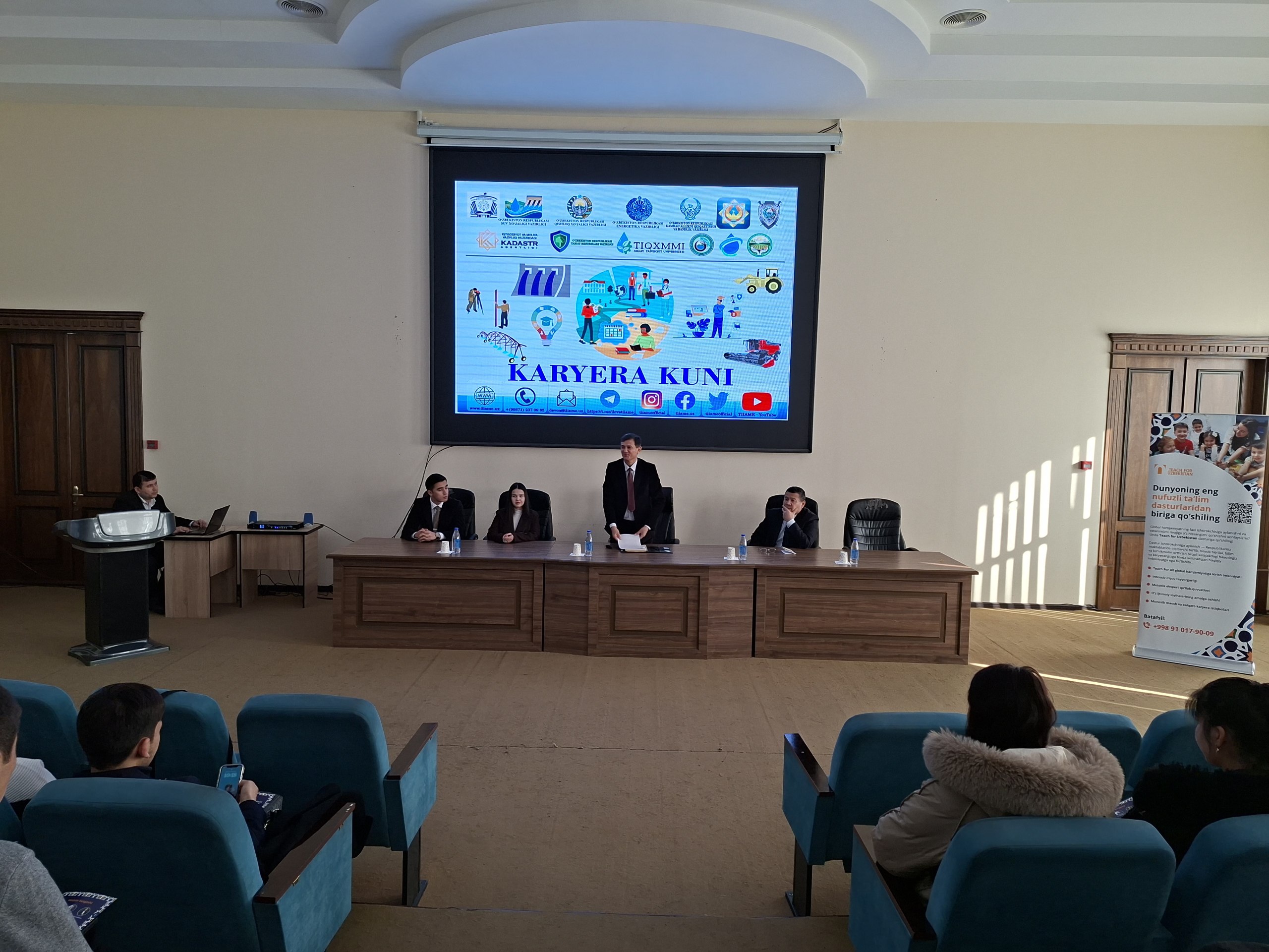 “Teach for Uzbekistan” nodavlat notijorat muassasasi xodimlari Berdiyeva Zarina hamda Inomjonov Yodgor tomonidan maktab ta’limi tizimini rivojlantirishga ko‘maklashish, xususan, og‘ir ijtimoiy sharoitdagi hududlarda joylashgan umumta’lim maktablariga iqtidorli, bilimli va yetakchilik salohiyatiga ega yosh yetakchilar va mutaxassislarni o‘qituvchi sifatida jalb etishda 4-bosqich bakalavr talabalari hamda magistratura bosqichining bitiruvchi talabalari uchun tashkilot faoliyati, dastur imkoniyatlari hamda mavjud vakant ish o‘rinlari yuzasidan taqdimot o‘tkazishdi.