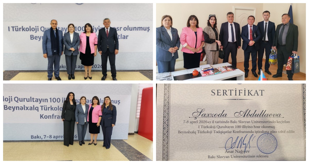 «TIQXMMI” Milliy tadqiqot universitetining “Tillar” kafedrasi mudiri, professor  Shaxzoda Abdullaeva  2026-yil 7-apreldan 8-aprelgacha bo‘lgan muddatda Baku Slavyan universiteti tomonidan tashkil etilgan “Baynalminal turkologiya tadqiqotlari” mavzusidagi anjumanda  “Komparativ talqin  asosida  Abdulla Oripov  va Zelimxan  Yaqub  ijodini ta'lim muassasalarida o‘rganishning pedagogik ahamiyati “ ma'ruzasi bilan ishtirok etdi va tegishli sertifikat olishga muvaffaq bo‘ldi.